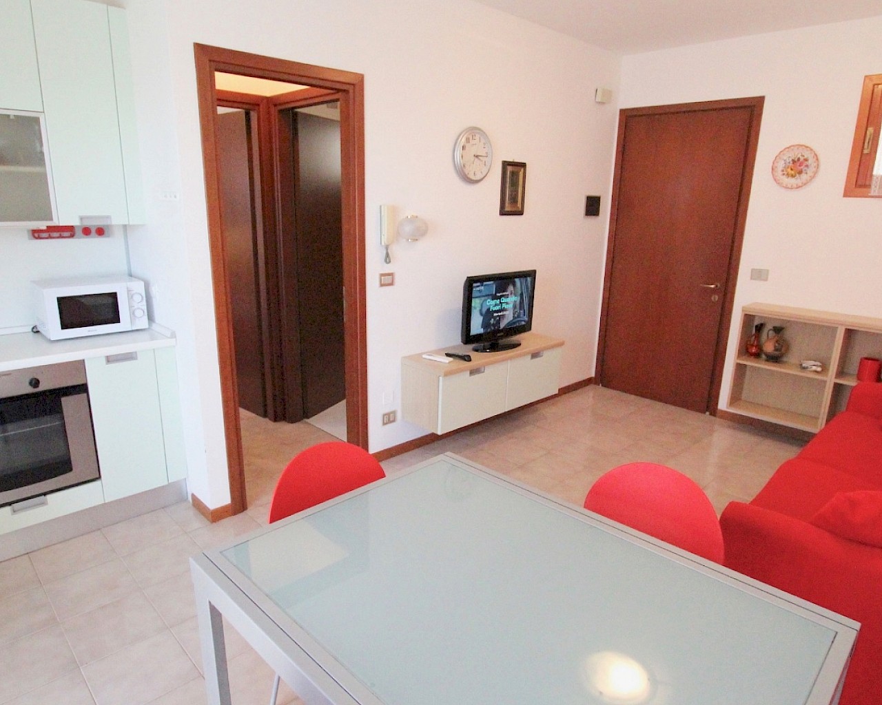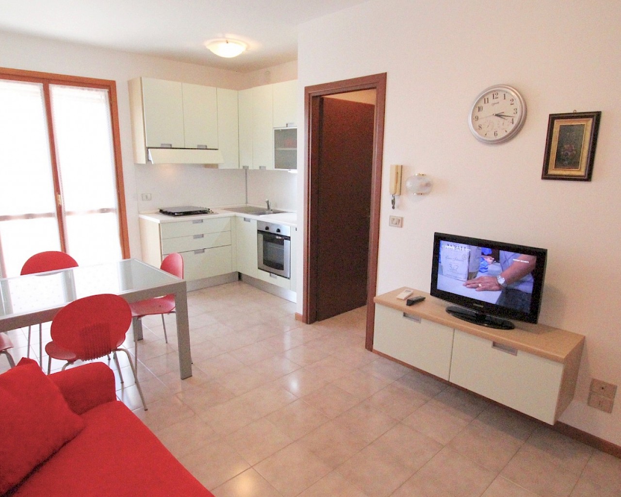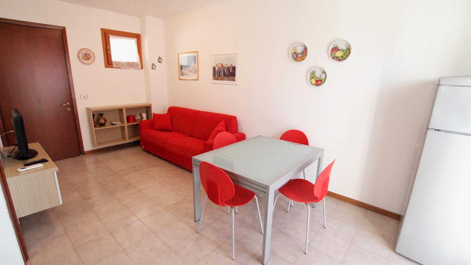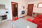 Situato al primo piano senza ascensore, composto da soggiorno con angolo cottura e divano letto matrimoniale, una camera matrimoniale, bagno finestrato con box doccia. Un' ampio terrazzo che permette di pranzare all'esterno.