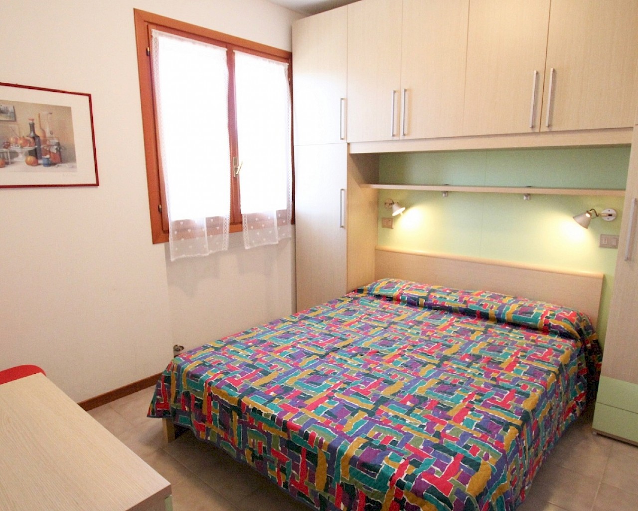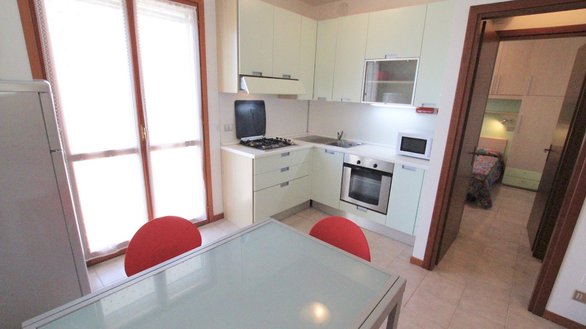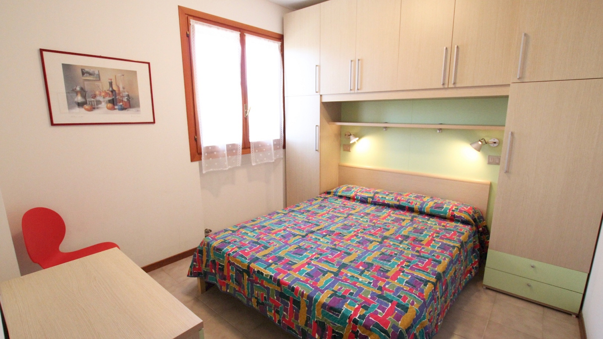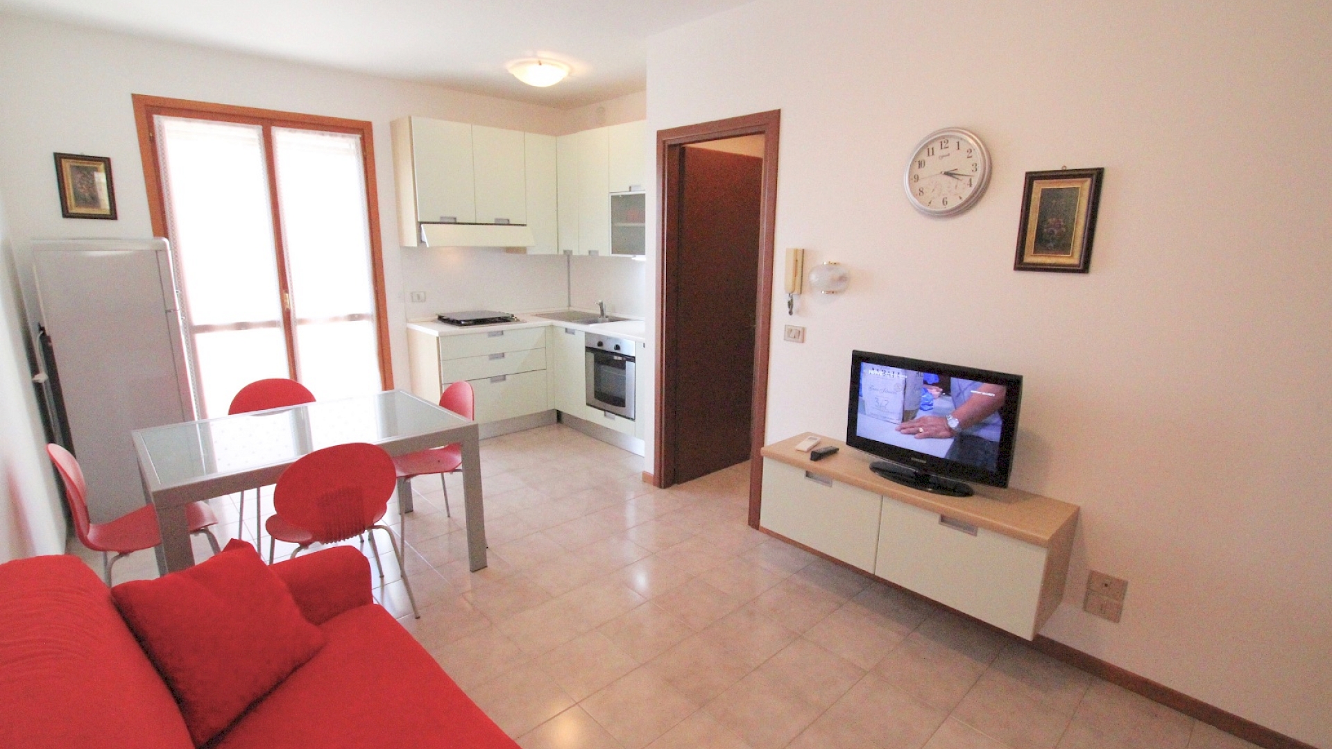 Situato al primo piano senza ascensore, composto da soggiorno con angolo cottura e divano letto matrimoniale, una camera matrimoniale, bagno finestrato con box doccia. Un' ampio terrazzo che permette di pranzare all'esterno.